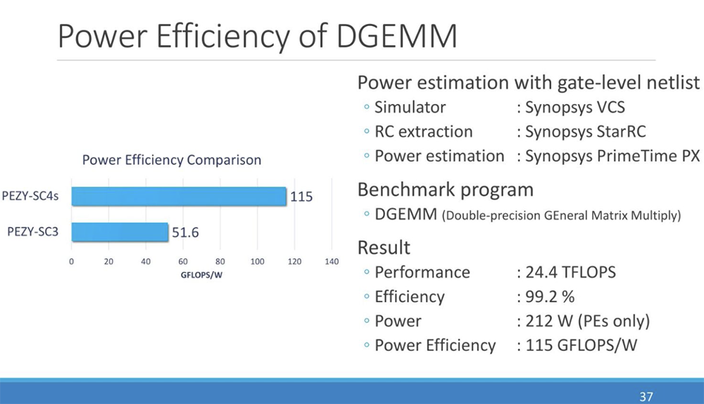 PEZY还对其设计进行了仿真,以了解其功耗和性能表现。与上一代相比,预计PEZY-SC4s在执行DGEMM工作负载时,功率效率将提高至2倍以上。