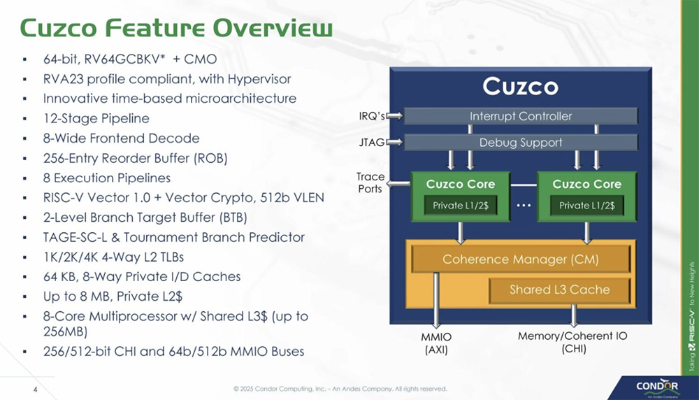 Cuzco的优势包括降低成本、提高能效,每cluster有8个高性能计算CPU核心,符合面向高性能RISC-V计算的最新RISC-V配置文件(RVA23规范),以实现最大的软件兼容性,并完全支持指令集架构(ISA)定制。