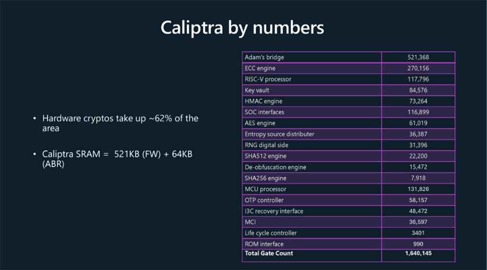 微软还详细分析了不同功能的门数。硬件密码占了62%的面积。