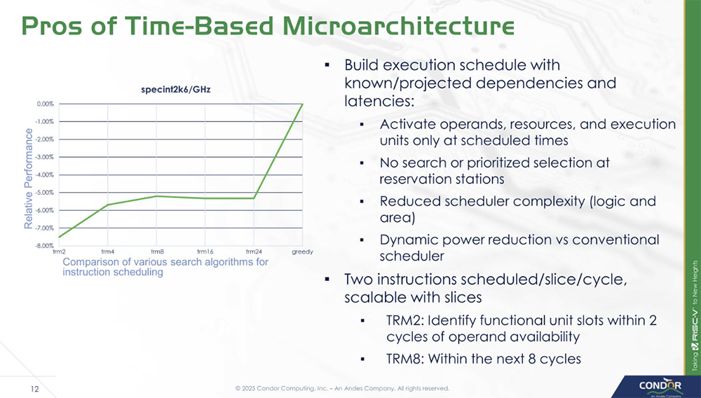 为什么采用基于时间的微架构?Condor解释说,这种设计的好处在于,调度的确定性降低了宽机器的逻辑复杂性,消除复杂的运行时每周期调度减少动态功率。Cuzco性能模型和设计为这种微架构方法提供了一个方向。