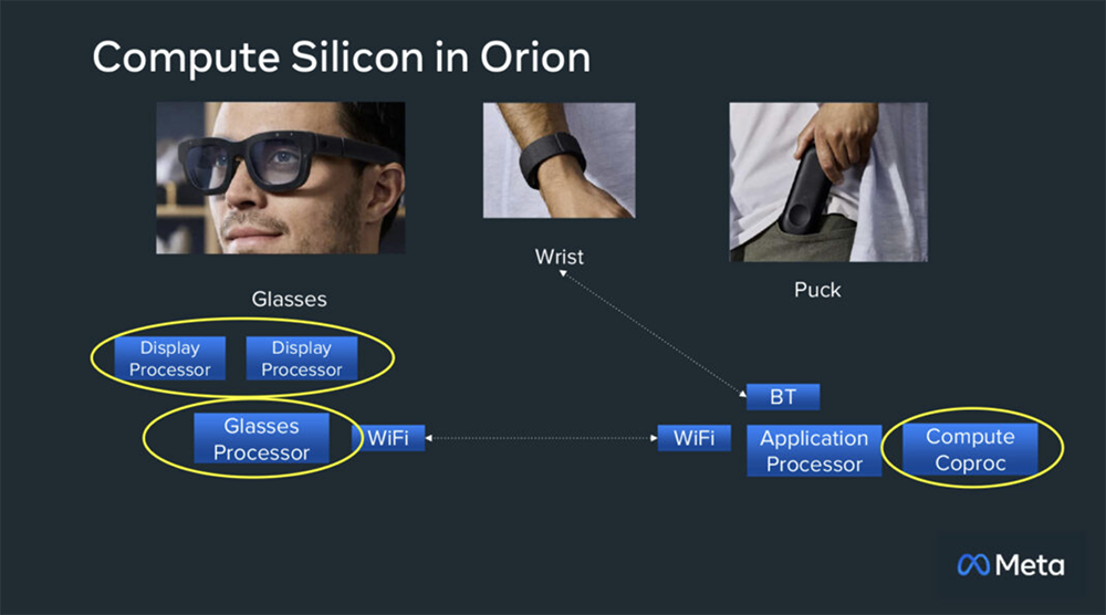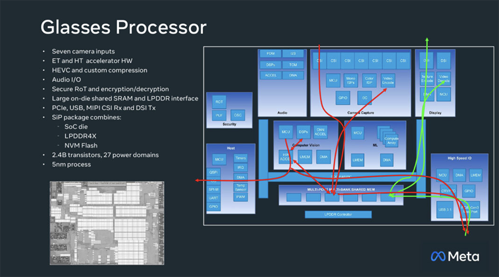 眼镜处理器负责处理所有眼部、手部追踪以及摄像头输入。它采用SiP封装、5nm工艺,总共集成了24亿颗晶体管。Meta还在芯片中植入了安全信任根,确保所有进出芯片的数据都经过加密。