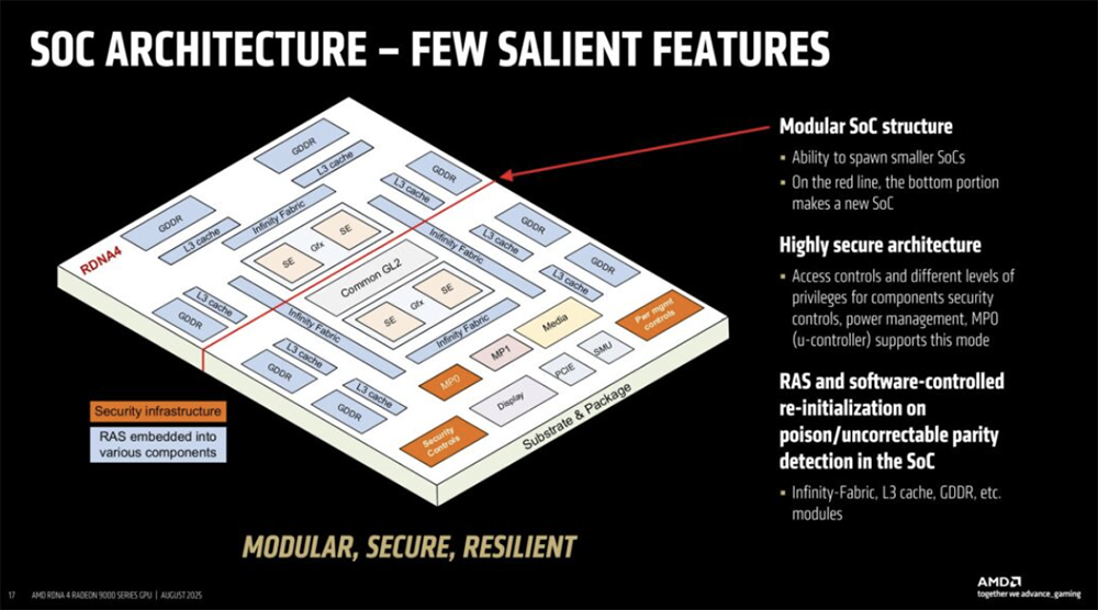 RDNA 4结构是模块化的。AMD设计的Navi 48可将其切成两半,制造出更小的GPU,减少了开发GPU变体所需的工作量。这也是RAS功能发挥作用以提高可靠性之处。