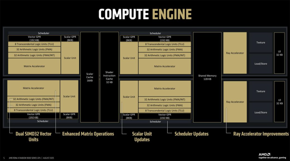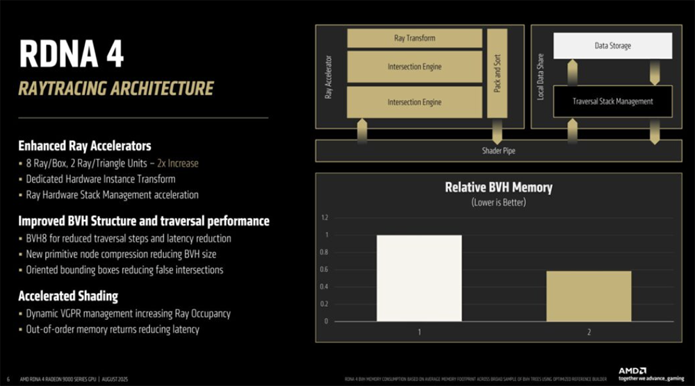 计算引擎中,标量单元增加了浮点支持。光线追踪方面,RDNA 4的光线求交性能翻倍,还新增了一个专用的硬件实例转换器,将该任务从着色器程序中转移出来。BVH结构从4列加宽至8列。节点压缩也减少了BVH的尺寸。