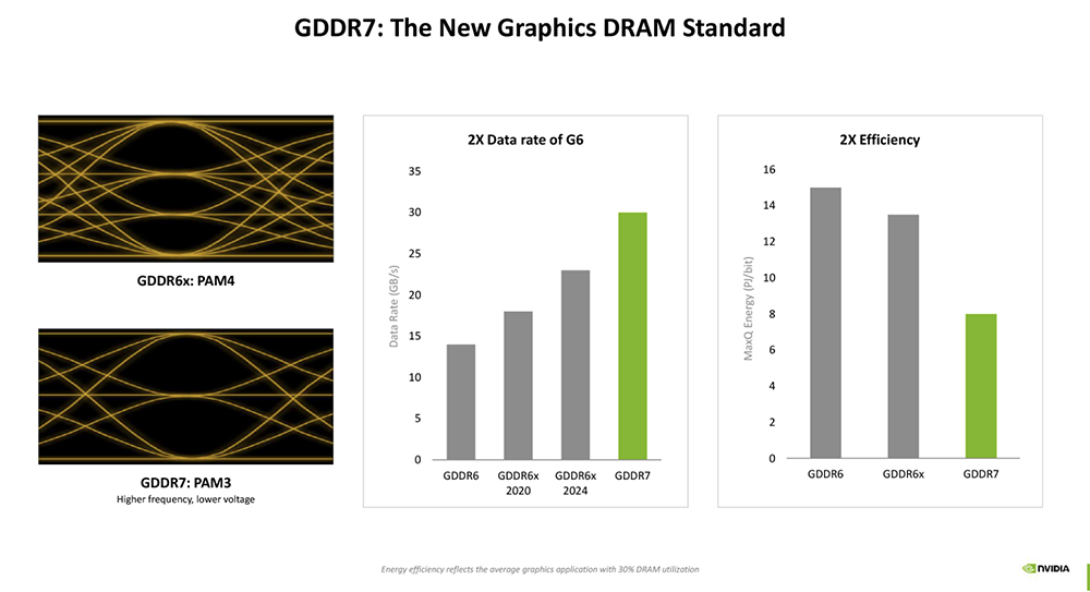 英伟达大量使用着色器执行重排序技术,以保持SM的满载。Blackwell增加了GDDR7支持,显著提升了总内存带宽。与PAM4(GDDR6X)相比,PAM3提供的每时钟位数较少,但更高的信噪比(SNR)允许更高的时钟速度,足以弥补差异,还支持更低的电压。