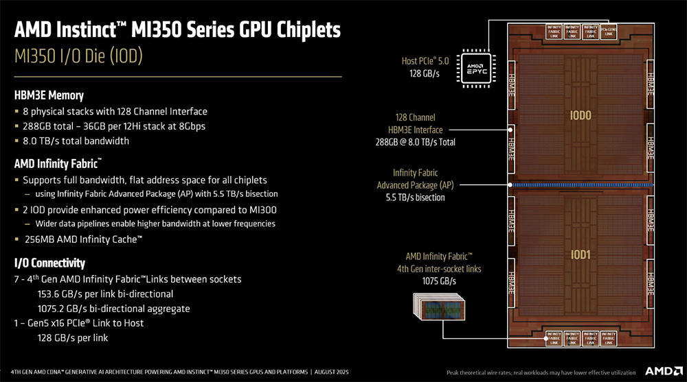 相比上一代,MI350系列的2个I/O die提供更宽、更低时钟频率的D2D连接,以实现更高能效。