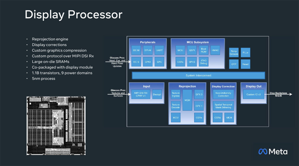 每只眼睛各对应一个显示处理器,运行重新投影(时间扭曲)。这里没有外部存储器,所有内容都存储在片上 SRAM 中,所以SRAM容量会很大。
