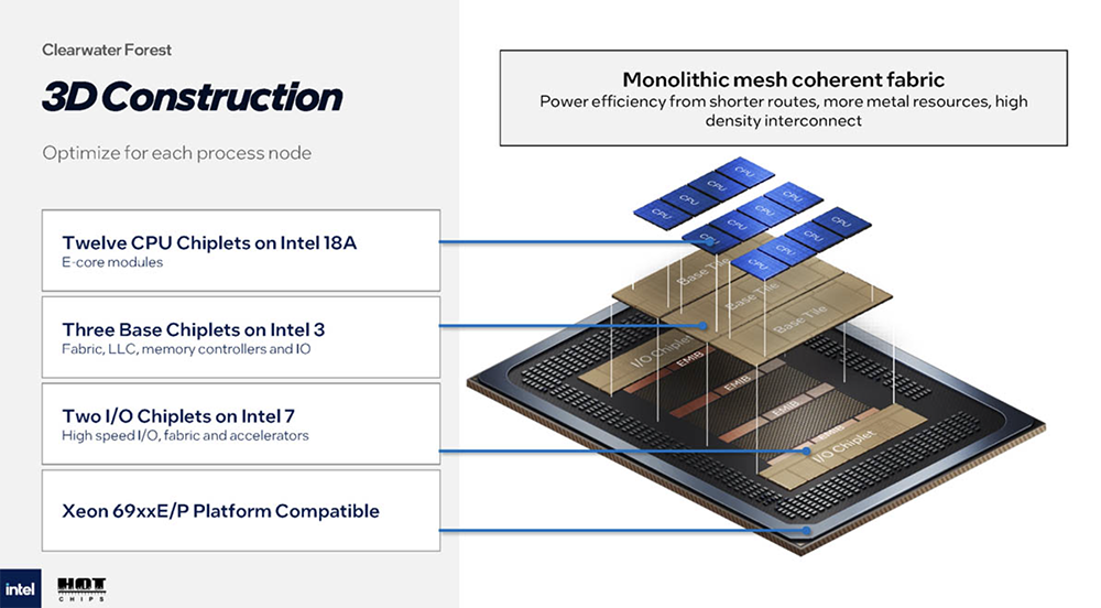 12个能效核CPU Chiplet采用Intel 18A工艺,3个基础Chiplet采用Intel 3工艺。2个I/O Chiplet则沿用了Sierra Forest的工艺,采用Intel 7工艺。英特尔仍用EMIB进行芯片间互连。