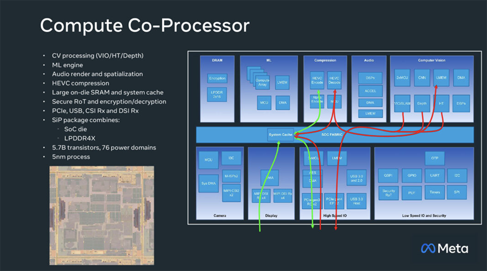 计算协处理器同样采用5nm工艺,配备LPDDR4X内存,集成了57亿颗晶体管,是Orion眼镜中性能最强、功耗和发热量最高的处理器,包括计算机视觉处理、机器学习执行、音频渲染、HEVC 编码等功能,拥有相对较大的片上SRAM缓存。
