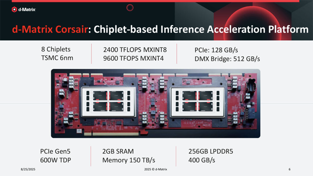 每张Corsair PCIe卡包括2个封装,每个封装有4个chiplet,采用台积电6nm工艺,总共提供2GB SRAM,带宽高达150TB/s(远高于传统HBM),峰值功耗为600W,800MHz时功耗为275W,1.2GHz时功耗为550W。