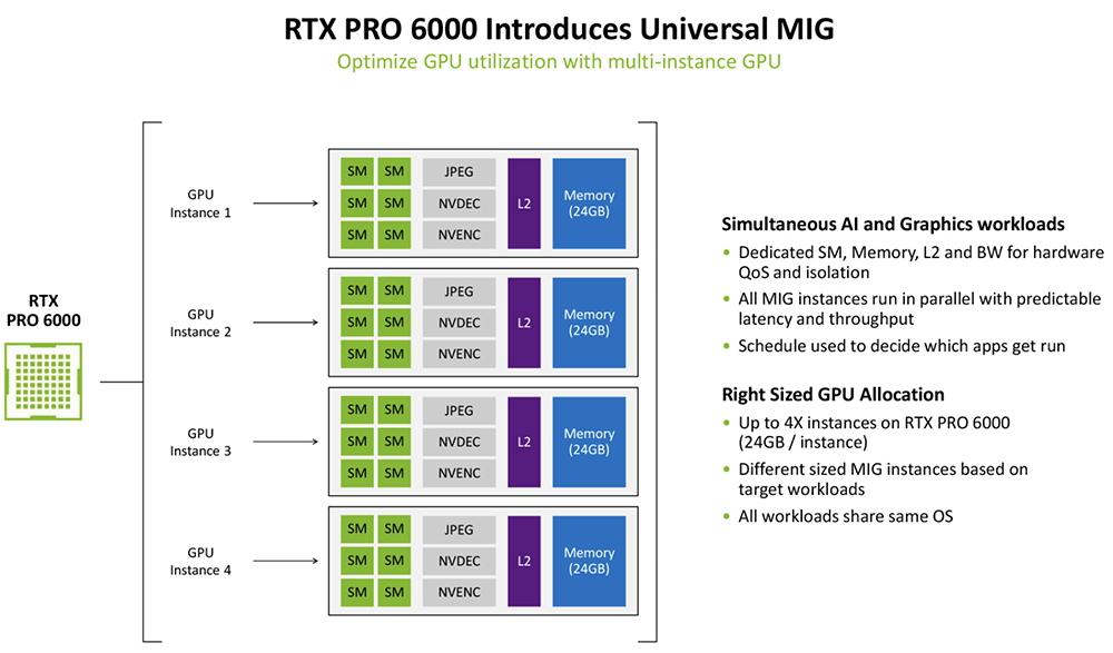 Blackwell图形GPU还支持通用MIG(多实例GPU)。与timeslicing相比,英伟达发现4个MIG可将性能提升60%。