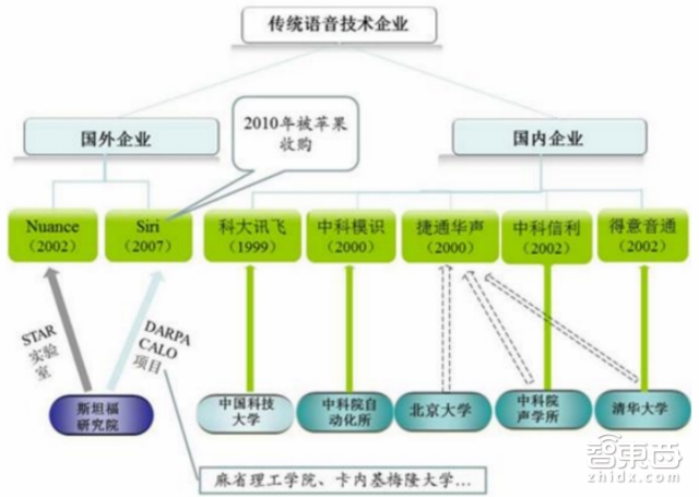 智能语音产业参与者可以分为两大流派:从科研实验室走出来的独立语音技术提供商以及希望抢占下一代入口的互联网巨头。作为科研驱动型行业,智能语音技术研究最早起源于贝尔实验室,斯坦福、卡内基梅隆等学校的研究为智能语音产业发展奠定了坚实的基础,苹果 Siri的雏形便是源自于斯坦福研究院联合麻省理工学院、卡内基梅隆大学等多家机构承担的美国国防高级研究计划局(DARPA)的CALO项目。Nuance也是源于斯坦福研究院的STAR实验室。