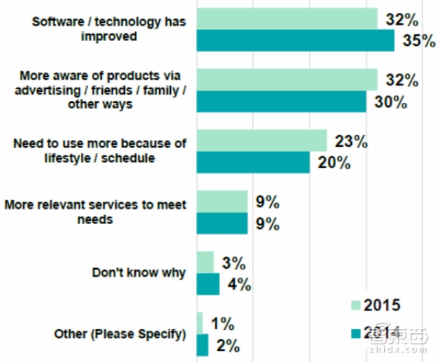 语言识别技术和硬件发展驱动语音交互渗透率迅速提升。根据研究机构 Thrive Analytics 统计,2015年美国智能手机用户使用语音交互的比例较 2013年提升了一倍以上,而他们的用户调查同时显示软件/技术的改善是选择使用语音交互的最主要原因。