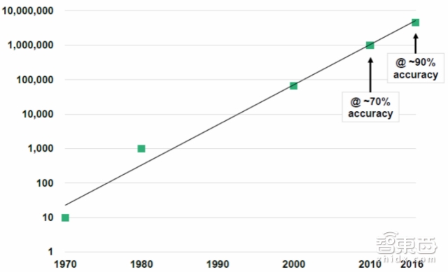 随着自然语言处理技术及硬件设备的发展,语音识别的准确率与响应时间持续得到改善,驱动语音交互方式快速渗透。从1970年到2016年,语音识别的数目量级呈几何增长,2010年开始,准确率已经达到70%,到今年的进展准确率则已经达到了90%。