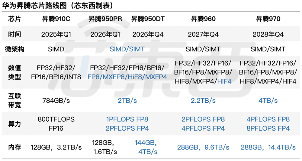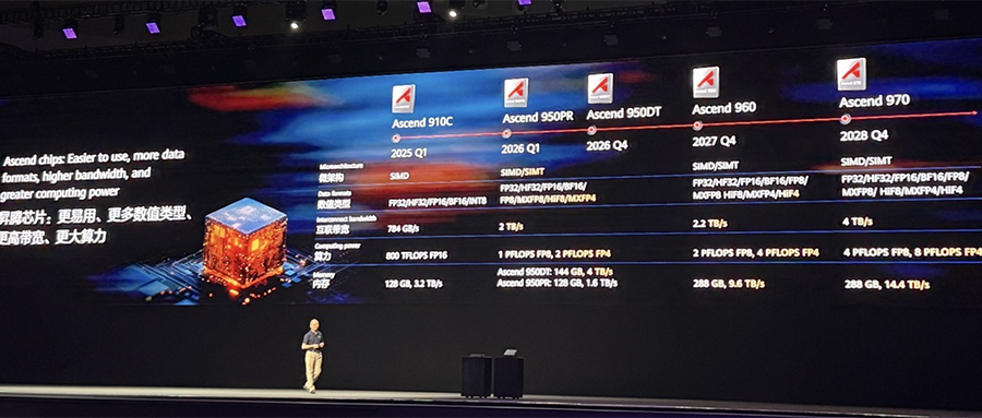 华为在今年第一季度推出昇腾910C AI芯片,预计将于2026年第一季度推出昇腾950PR,2026年第四季度推出昇腾950DT,2027年第四季度推出昇腾960,2028年第四季度推出昇腾970。