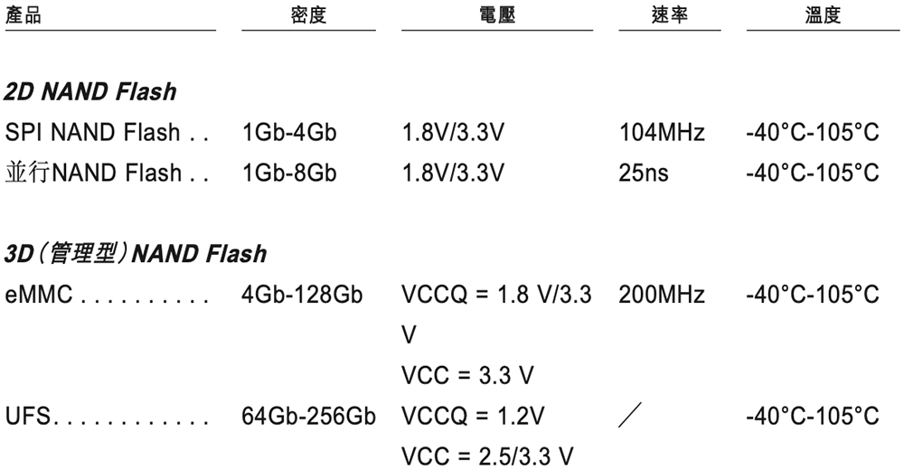 ▲北京君正2D NAND Flash和3D(管理型)NAND Flash产品的主要规格