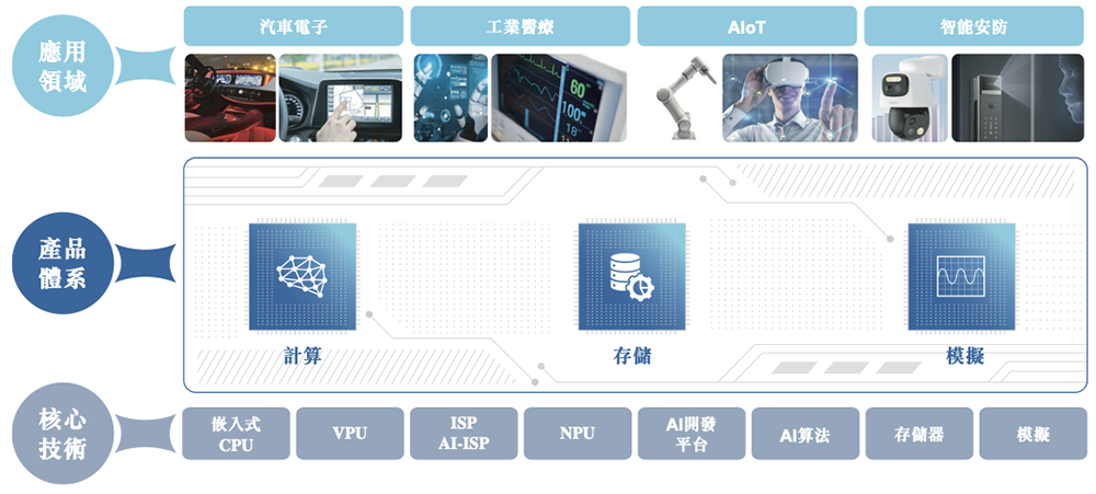 其计算芯片产品线包括一系列基于自研核心计算单元的高性能低功耗SoC,例如CPU、VPU、NPU、ISP及AI-ISP。该等产品线涵盖三个子产品线:智能视觉SoC、嵌入式MPU、AI-MCU。