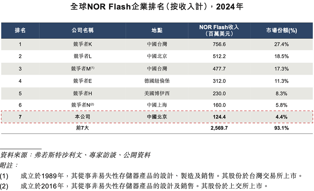 - NOR Flash:排名全球第七、国内第三,并在全球车规级NOR Flash供应商中排名第四;