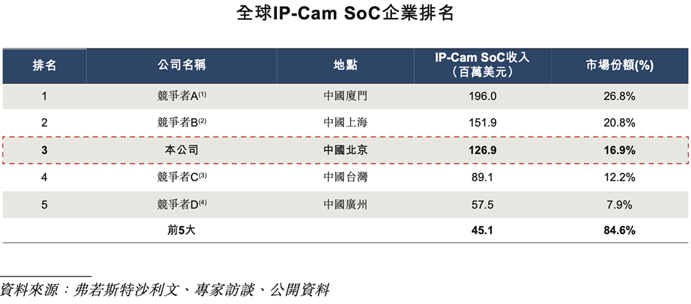 - IP Cam SoC:排名全球第三,并在全球电池类IP-Cam SoC供应商中排名第一。