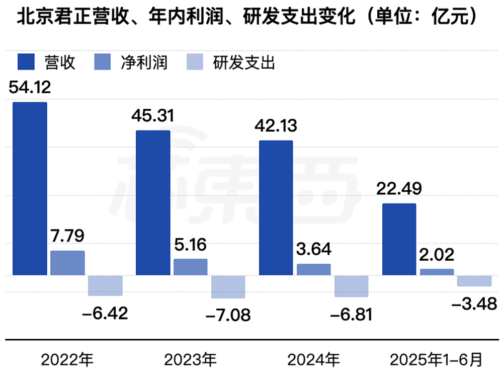2022年、2023年、2024年、2025年1-6月,北京君正的收入分别为54.12亿元、45.31亿元、42.13亿元、22.49亿元,年内利润分别为7.79亿元、5.16亿元、3.64亿元、2.02亿元,研发费用分别为6.42亿元、7.08亿元、6.81亿元、3.48亿元。