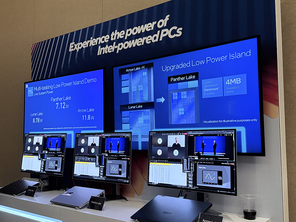 英特尔在Demo区展示了Panther Lake与Arrow Lake和Lunar Lake的低功耗岛对比,在演示期间,Panther Lake的功耗比主打高能效的Lunar Lake还要低。