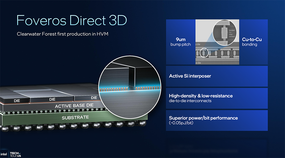 Foveros Direct 3D封装可将采用不同工艺节点、不同功能的芯片模块垂直堆叠,bump pitch间距仅为9μm,通过铜与铜直接键合,能高效地在顶层与底层之间完成所有信号处理任务,实现更高互连带宽和更低功耗。