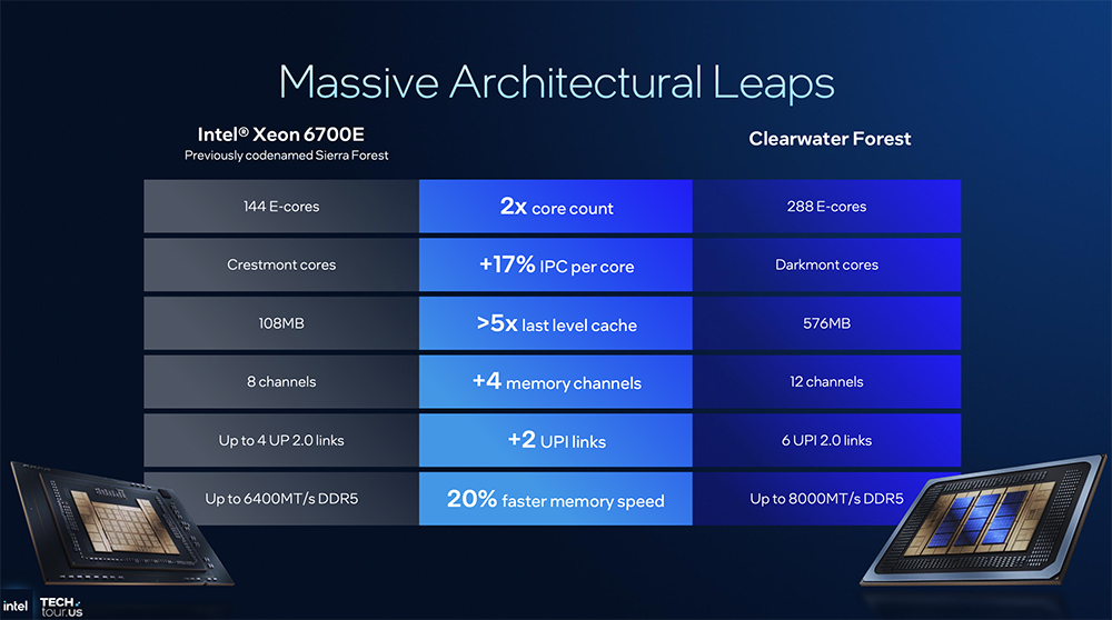 与上一代至强6700E相比,Clearwater Forest的E核数量翻倍,每核心每周期指令数(IPC)提升17%,拥有超过5倍的末级缓存(576MB),增加4个内存通道、2个UPI链接,DDR5带宽高达8000MT/s。