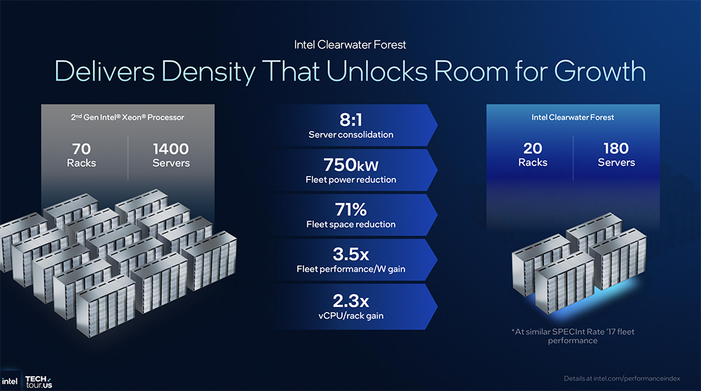 一座已运营5年的数据中心,拥有基于第二代至强的70个机架、1400台服务器。实现相同性能,改用Clearwater Forest只需20个机架、180台服务器,服务器整合率达到8:1,可节省750kW的功耗、提供3.5倍的每瓦性能。