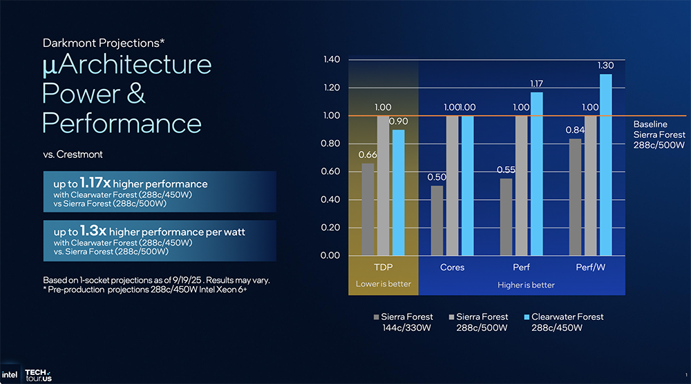 跟288核的Sierra Forest相比,Clearwater Forest性能可提升17%,每瓦性能可提升30%。