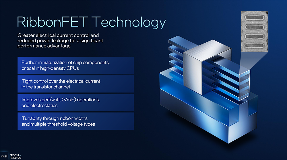 RibbonFET是全环绕栅极(GAA)晶体管架构,采用由栅极完全环绕、垂直堆叠的带状沟道,实现了更好的电流控制能力,并提供更强的驱动电流。