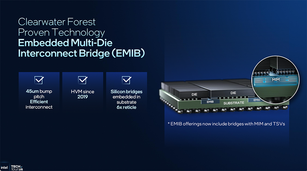 下面仍用EMIB 2.5D技术封装粘合(缓存和互连结构分布在底部)。