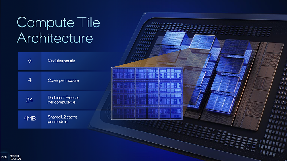 从下图可以看到,每个计算tile有6个模块,每个模块包含4个Darkmont E核、4MB共享L2缓存,因此每个计算tile有24个E核。