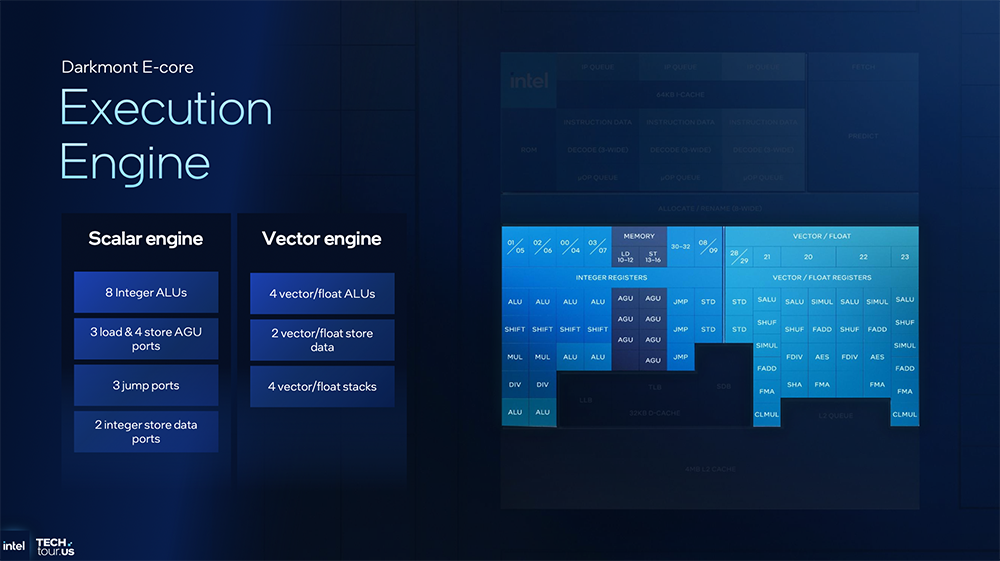 Darkmont E核在前端、乱序执行核心、后端执行端口三个阶段均有优化,使IPC显著增长。
