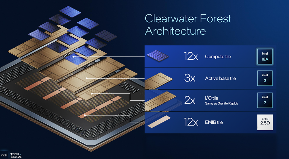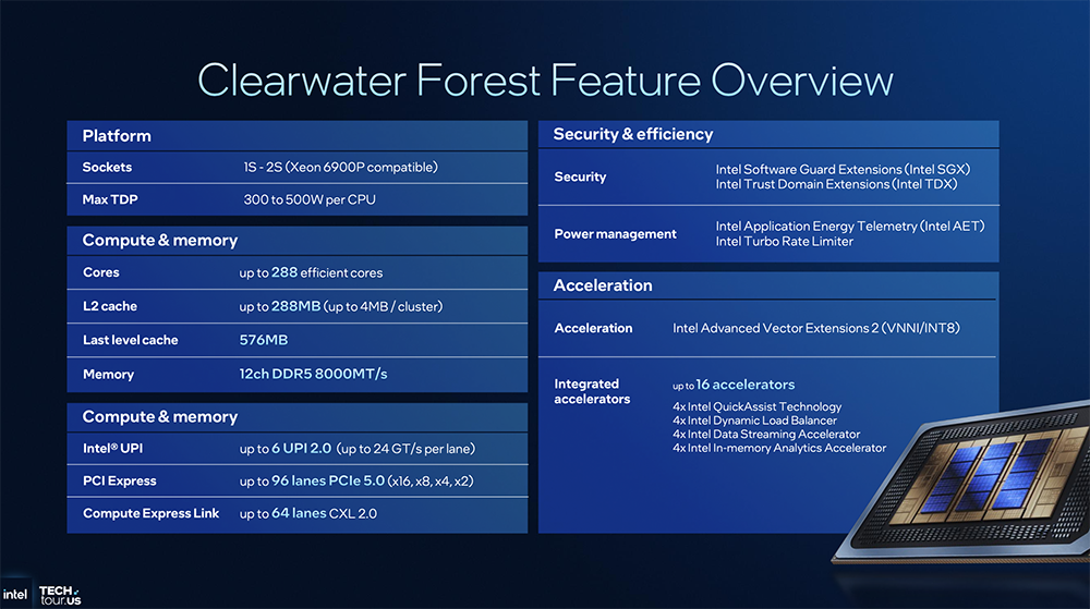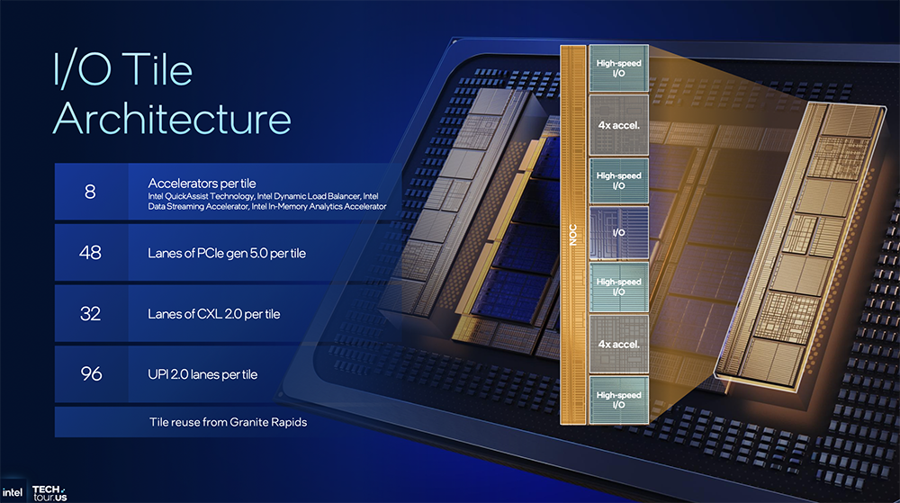 Clearwater Forest的I/O tile架构复用至强6设计,每tile有8个加速器、48个PCIe 5.0通道、32个CXL 2.0通道、96个UPI 2.0通道。