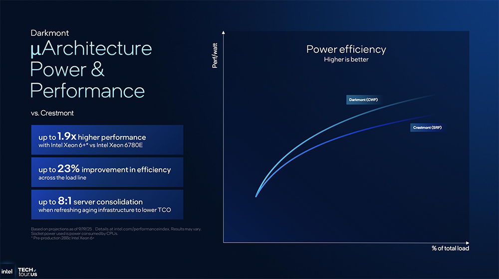 与Crestmont E核对比,Darkmont E核的每瓦性能曲线更高。至强6+的性能可达到至强6780E性能的1.9倍,能效提升23%。