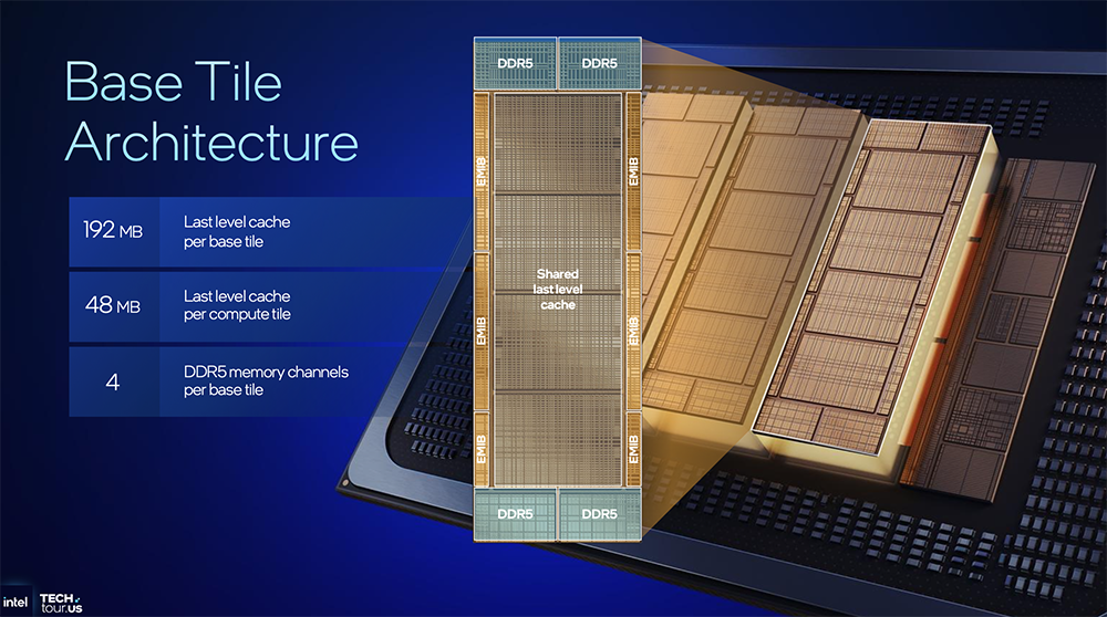 每个基础tile有192MB末级缓存、4个DDR5内存通道,每个计算tile有48MB末级缓存。