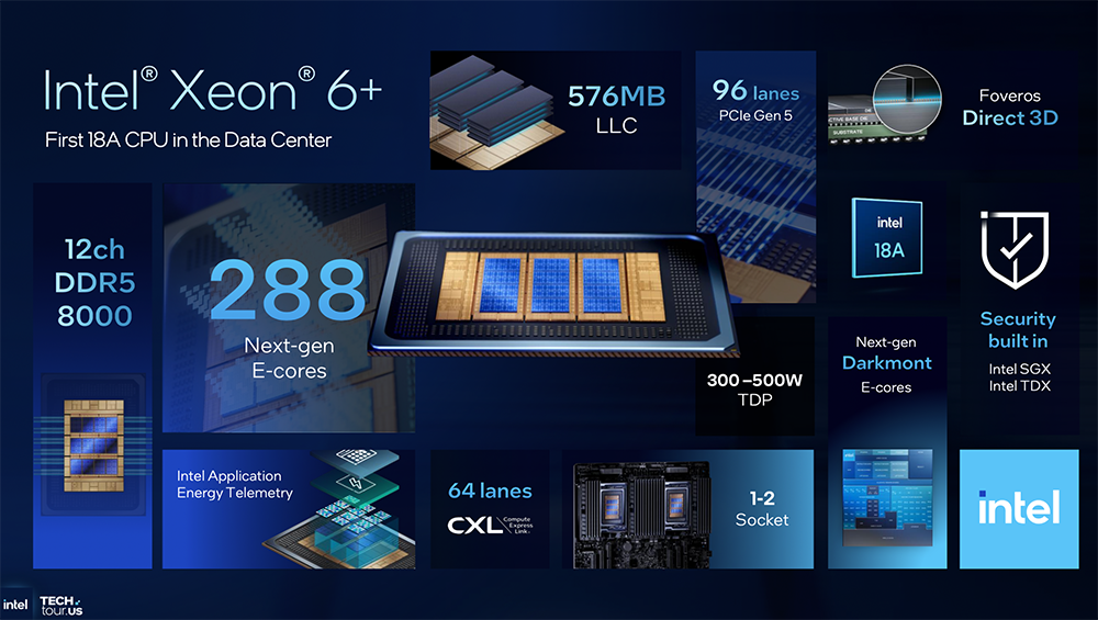 这是英特尔迄今最高效的服务器处理器,最多有288个新一代Darkmont E核(能效核),拥有更大的缓存、更快的能效核和更大的内存带宽,密度、吞吐量和功率效率方面均有显著提升,最大TDP为300-500W。