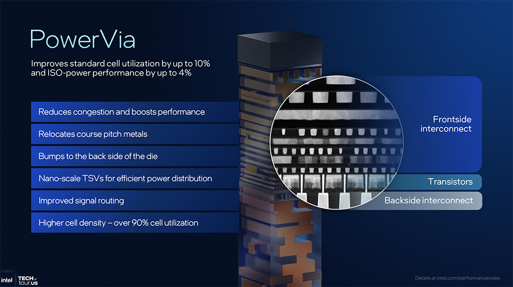 PowerVia背面供电技术解决了传统设计中混合信号线和电源线会争夺空间资源、造成拥塞的问题,将电源线移到晶体管背面,所有信号布线在正面,实现两者分离。这种创新带来单元利用率和密度提升多达10%,性能提升4%。