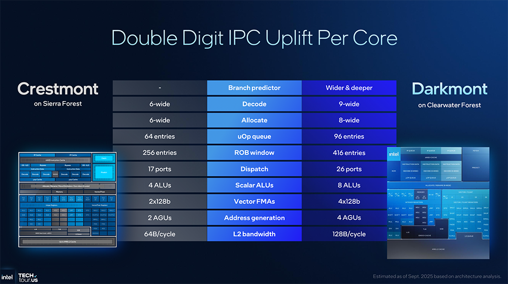与同样基于E核的Sierra Forest相比,新一代Darkmont E核有以下特点: