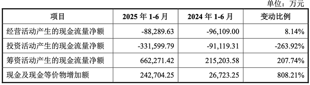 2025年1-6月,该公司经营活动产生的现金流量净额为-8.83亿元,较上年同期有所增加。筹资活动产生的现金流量净额为66.23亿元,较上年同期增加较多,主要原因为本期公司股权融资金额较大,吸收投资收到的现金大幅增加所致。