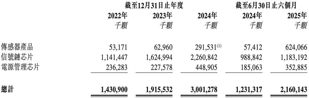 2022年、2023年、2024年、2025年1-6月,纳芯微传感器产品、信号链芯片、电源管理芯片的总销量分别为14.31亿颗、19.16亿颗、30.01亿颗、21.60亿颗。