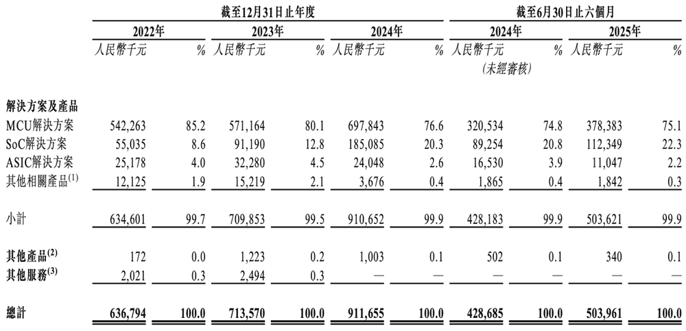 2025年上半年,其MCU、SoC、ASIC产品分别卖出了15.23亿件、0.99亿件、1.43亿件。