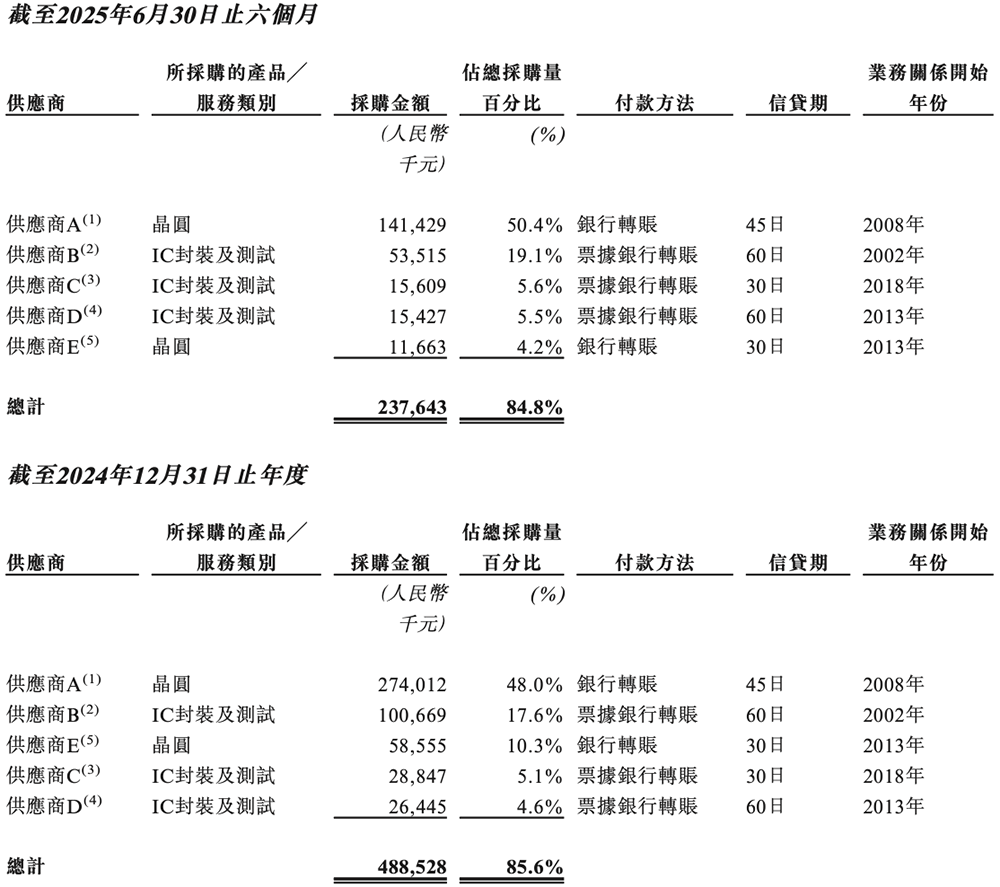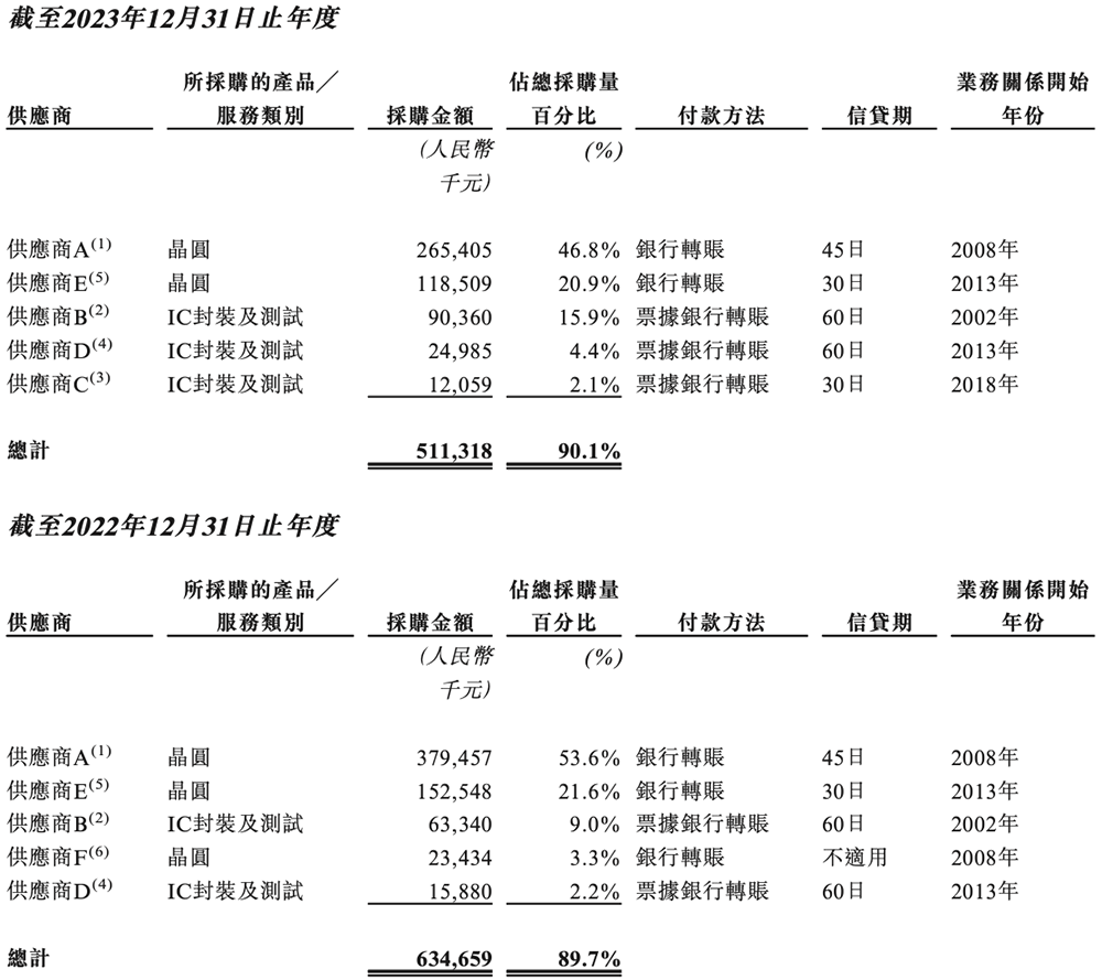 供应商A于往绩期间内各期间一直是中微半导最大供应商,为中微半导提供大部分由代工厂生产的晶圆。