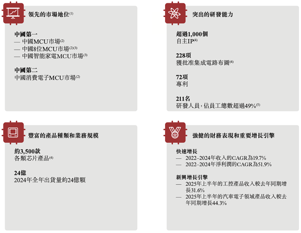 根据弗若斯特沙利文的研究资料,它是国内最早自主研发设计MCU的企业之一,2024年出货量排名中国市场第一、收入排名中国市场第三。其2024年全年出货量约24亿颗。