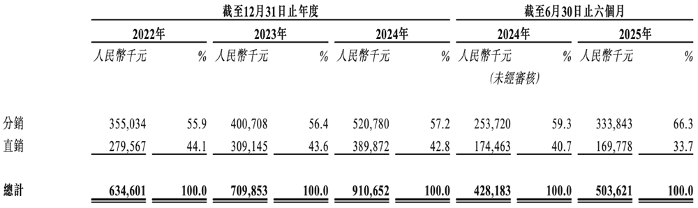 2022年、2023年、2024年、2025年1-6月,其分销收入占比逐年增长,客户留存率分别保持在66.0%、64.6%、73.2%、83.2%。
