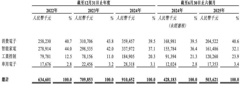 2025年上半年,消费电子、智能家电、工业控制、车用电子应用场景分别贡献了中微半导收入的40.6%、32.1%、23.9%、3.4%。