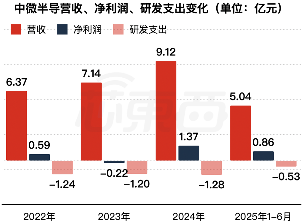 2022年、2023年、2024年、2025年1-6月,中微半导收入分别为6.37亿元、7.14亿元、9.12亿元、5.04亿元,净利润分别为0.59亿元、-0.22亿元、1.37亿元、0.86亿元,研发费用分别为1.24亿元、1.20亿元、1.28亿元、0.53亿元。