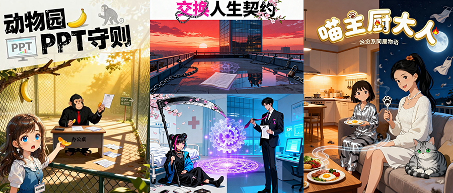 于是,我在“改编模式”中输入下面一段提示词:“新人饲养员林薇入职欢乐动物园,遵守《饲养员守则》成为生存关键。当穿西装的猿类递来PPT修改指令,听从老饲养员建议用芒果干、香蕉应付,既没违反“不回应”守则,还摸清了它收水果就不较真的规律,甚至听它跟黑猩猩抱怨年轻人做PPT要催。”