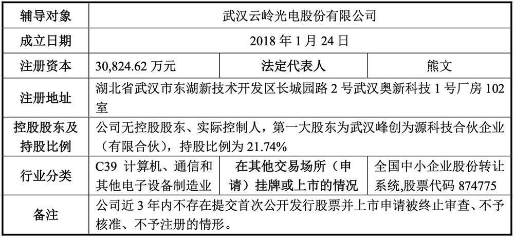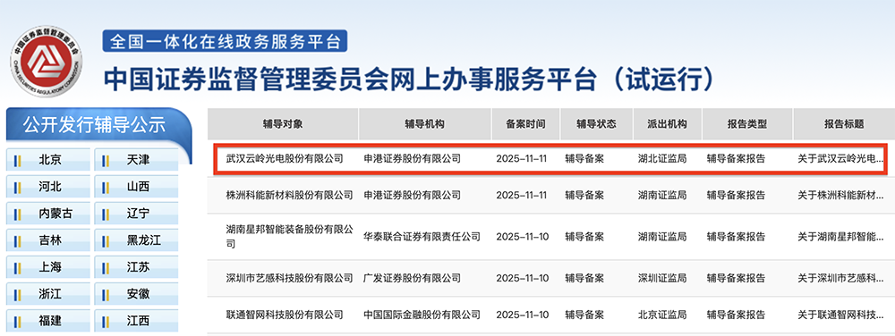 芯东西11月12日消息,11月11日,证监会官网披露,湖北武汉光通信芯片企业云岭光电在湖北证监局办理辅导备案登记,启动北交所上市辅导,辅导机构为申港证券。