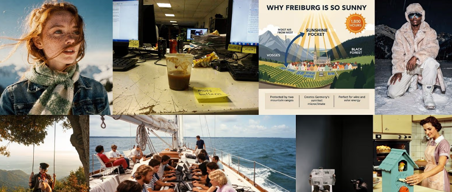 为考察两款模型的实用性,我们试着让它们打造了一张科普用途的简易插图,解释德国城市弗赖堡的阳光为何如此充足。图中的所有文字都是提示词提供的,但画面内容主要由模型自行发挥。