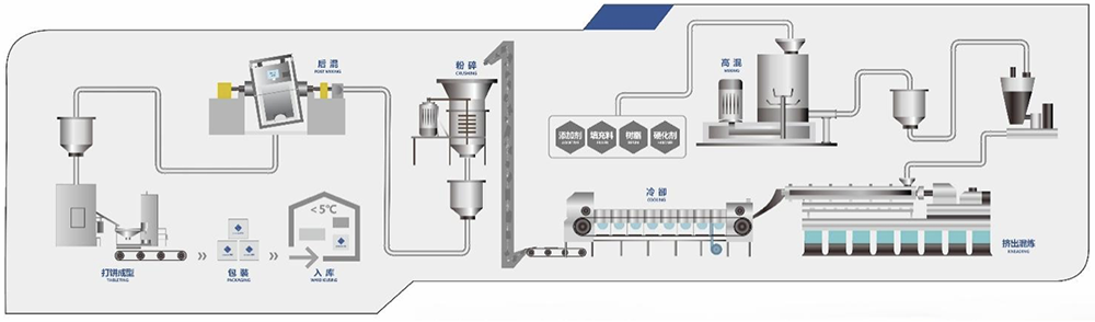 典型的饼状环氧塑封料产品,其生产流程主要涉及预处理、高混、挤出混炼、冷却、粉碎、成型等工序。